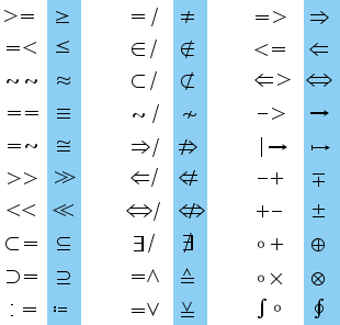 Wichtige mathematische Symbole, die weder auf der Tastatur noch in der Buttonleiste zu finden sind, können durch die Kombination von zwei Symbolen eingegeben werden: